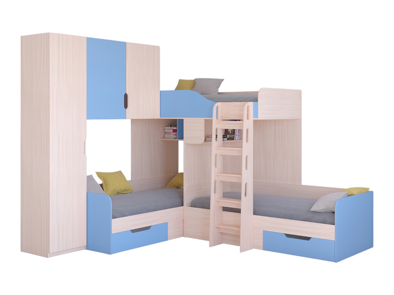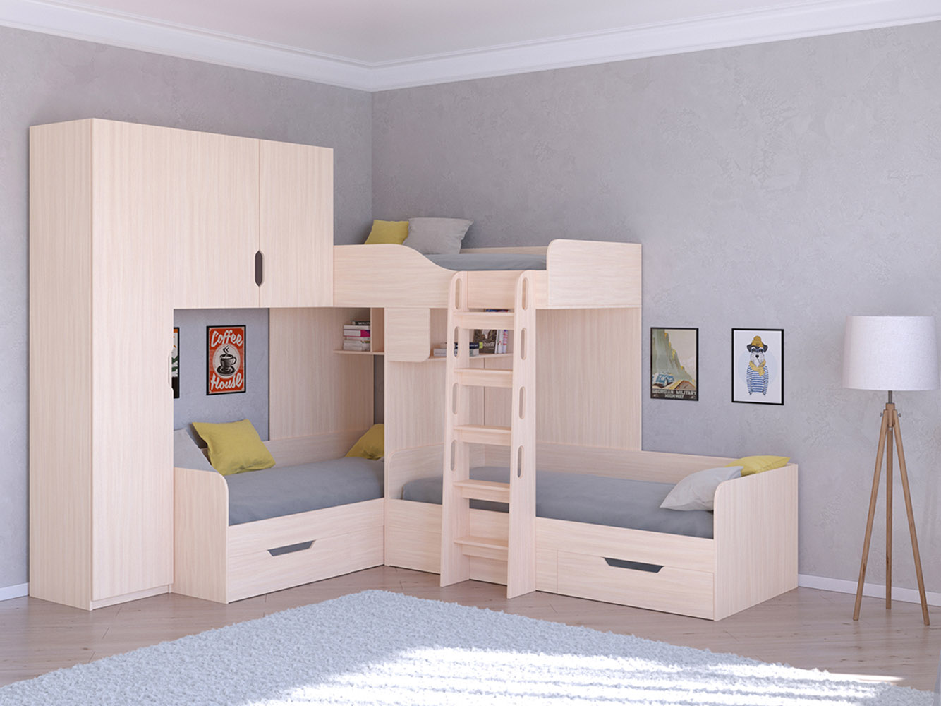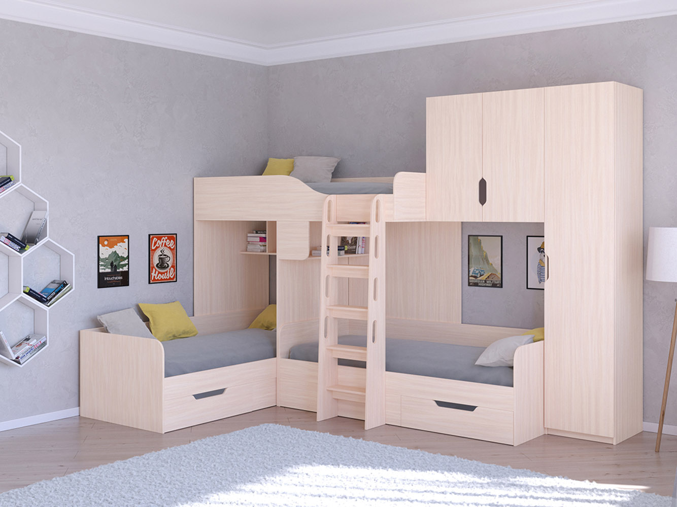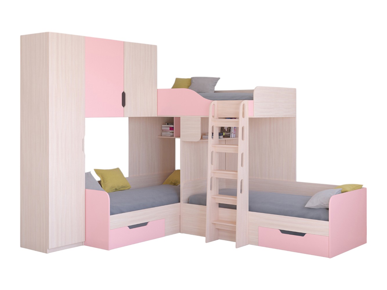 У каждого ребенка будет полноценная зона для сна, а для игрушек и одежды найдется место в ящиках, на полках и в высоком шкафу. Благодаря угловому расположению и дополнительному ярусу кровать экономит площадь, оставляя больше пространства для игр.