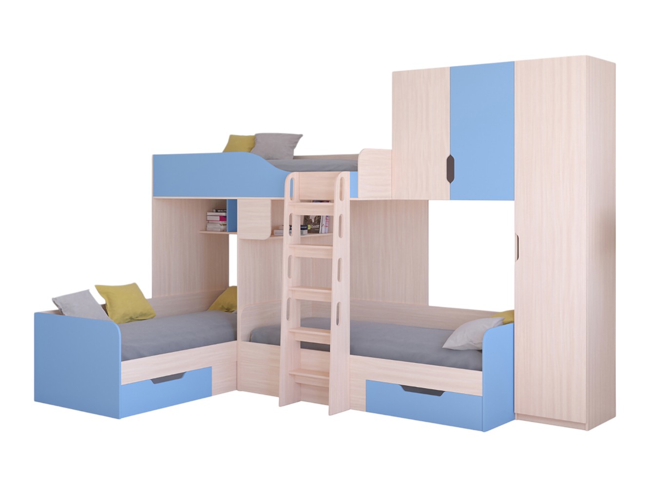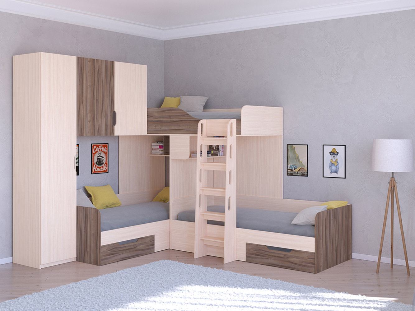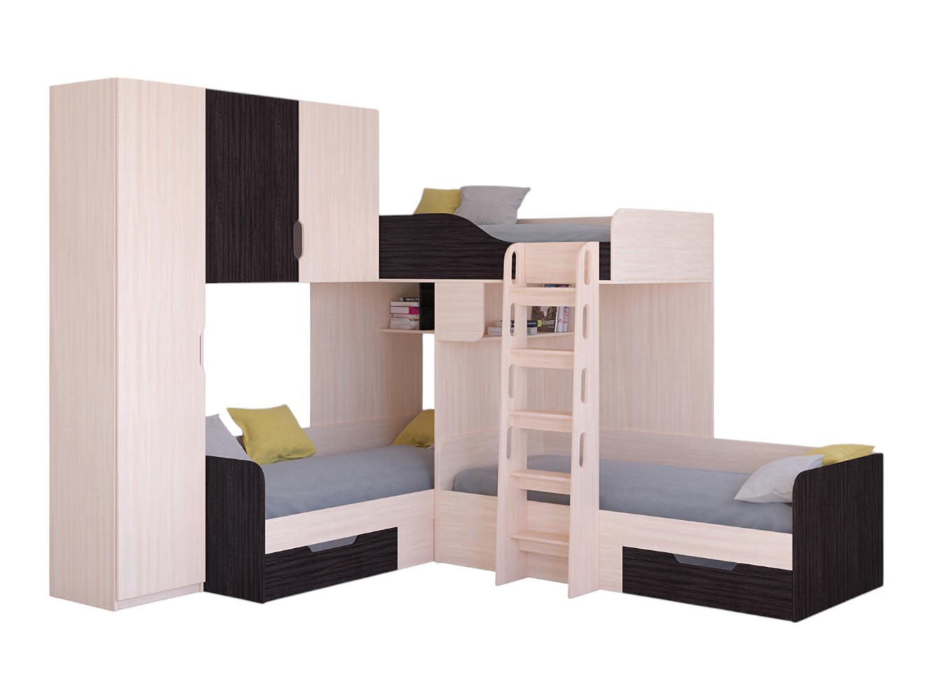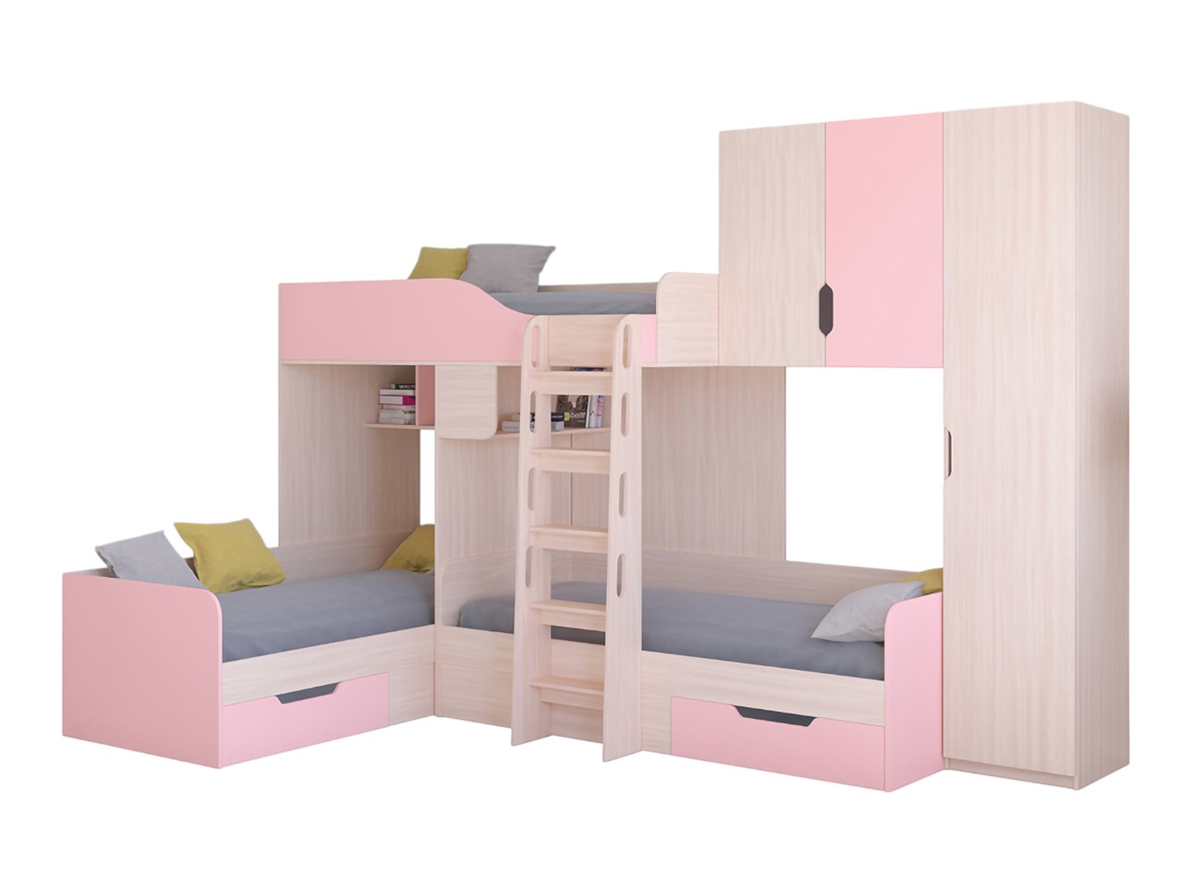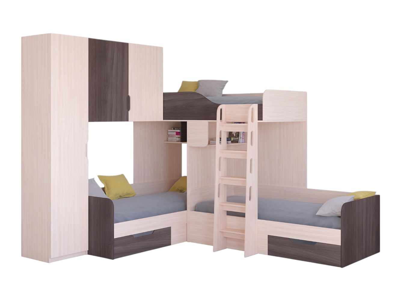 У каждого ребенка будет полноценная зона для сна, а для игрушек и одежды найдется место в ящиках, на полках и в высоком шкафу. Благодаря угловому расположению и дополнительному ярусу кровать экономит площадь, оставляя больше пространства для игр.