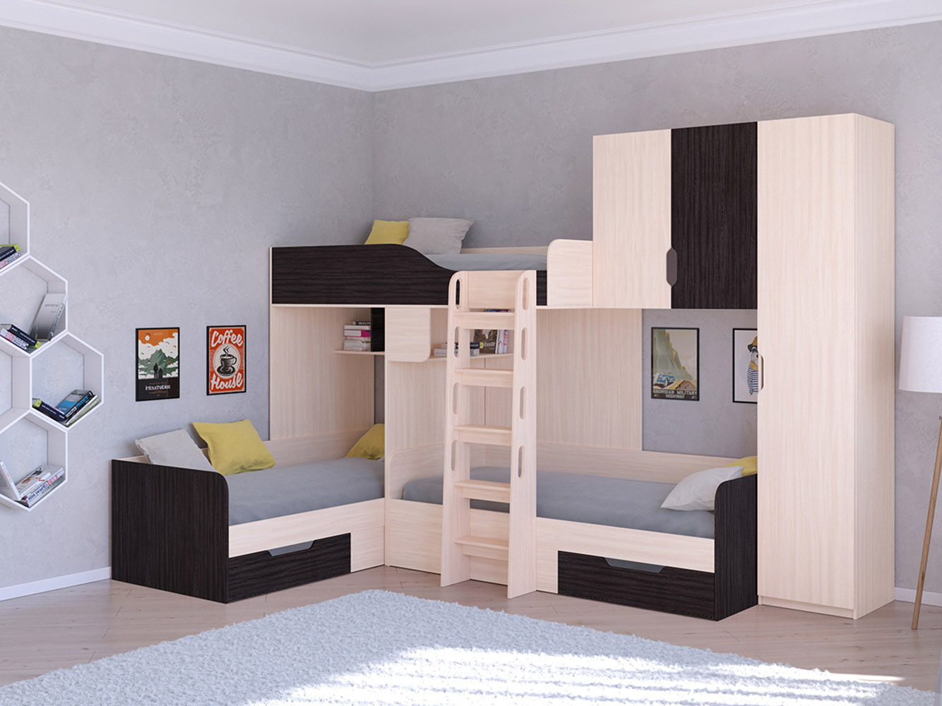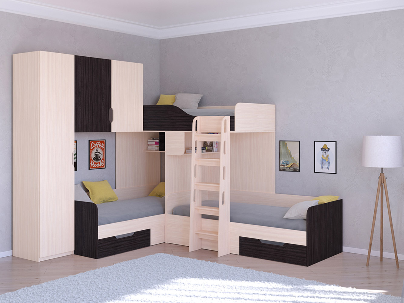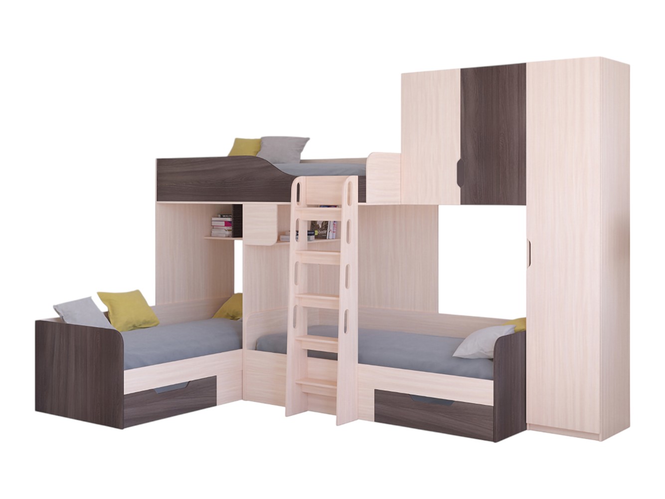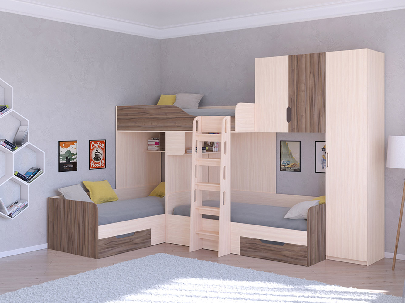 У каждого ребенка будет полноценная зона для сна, а для игрушек и одежды найдется место в ящиках, на полках и в высоком шкафу. Благодаря угловому расположению и дополнительному ярусу кровать экономит площадь, оставляя больше пространства для игр.