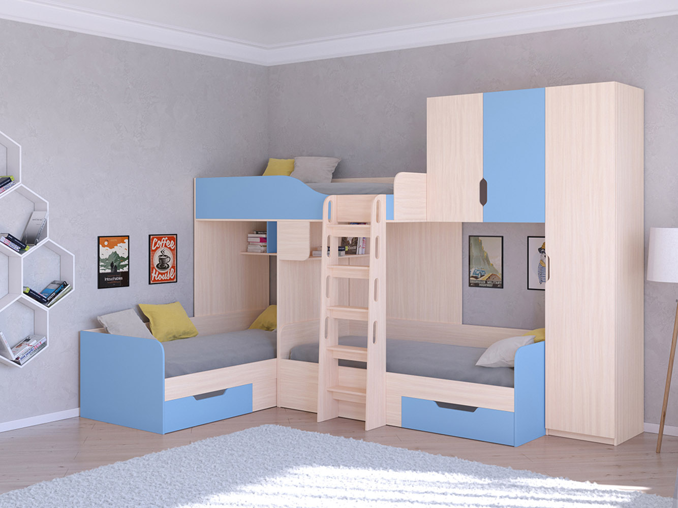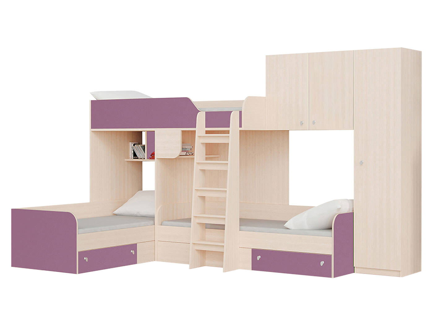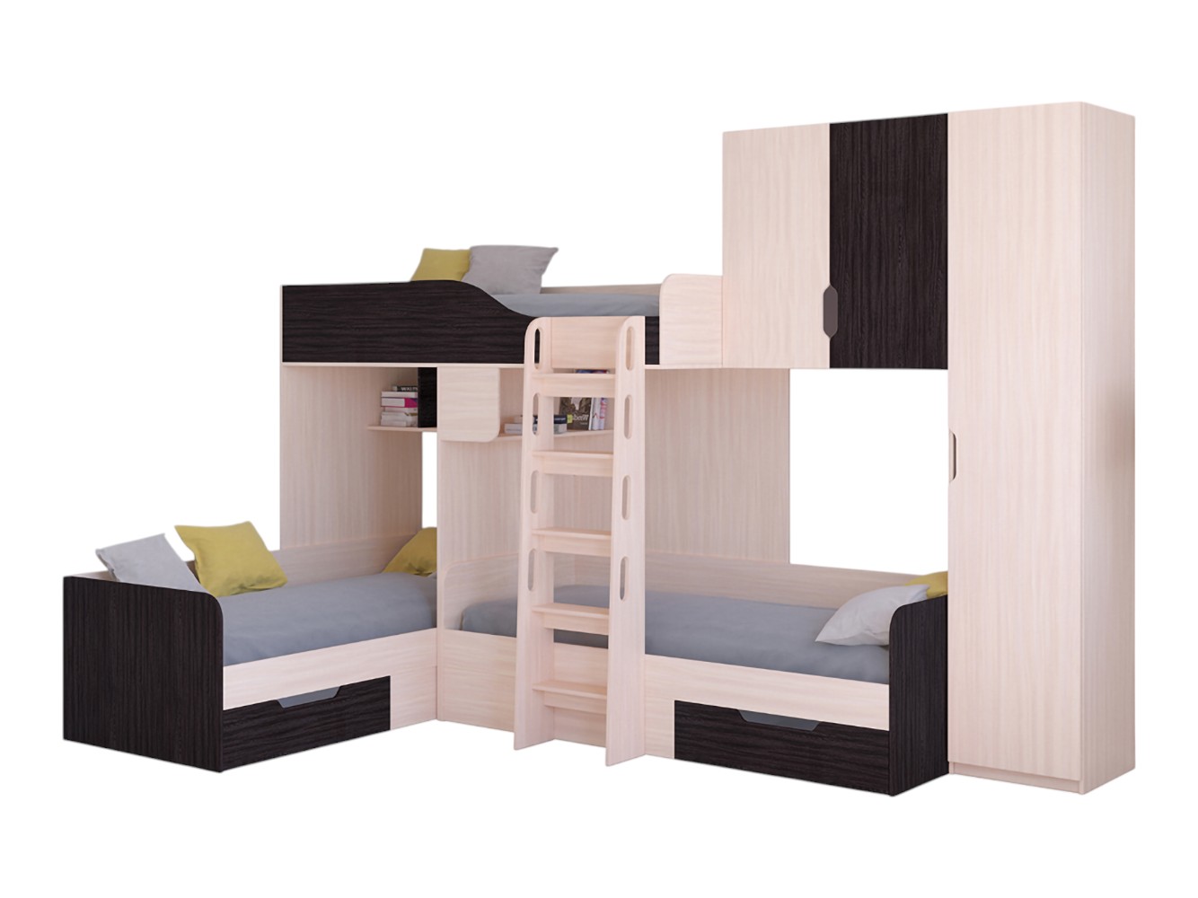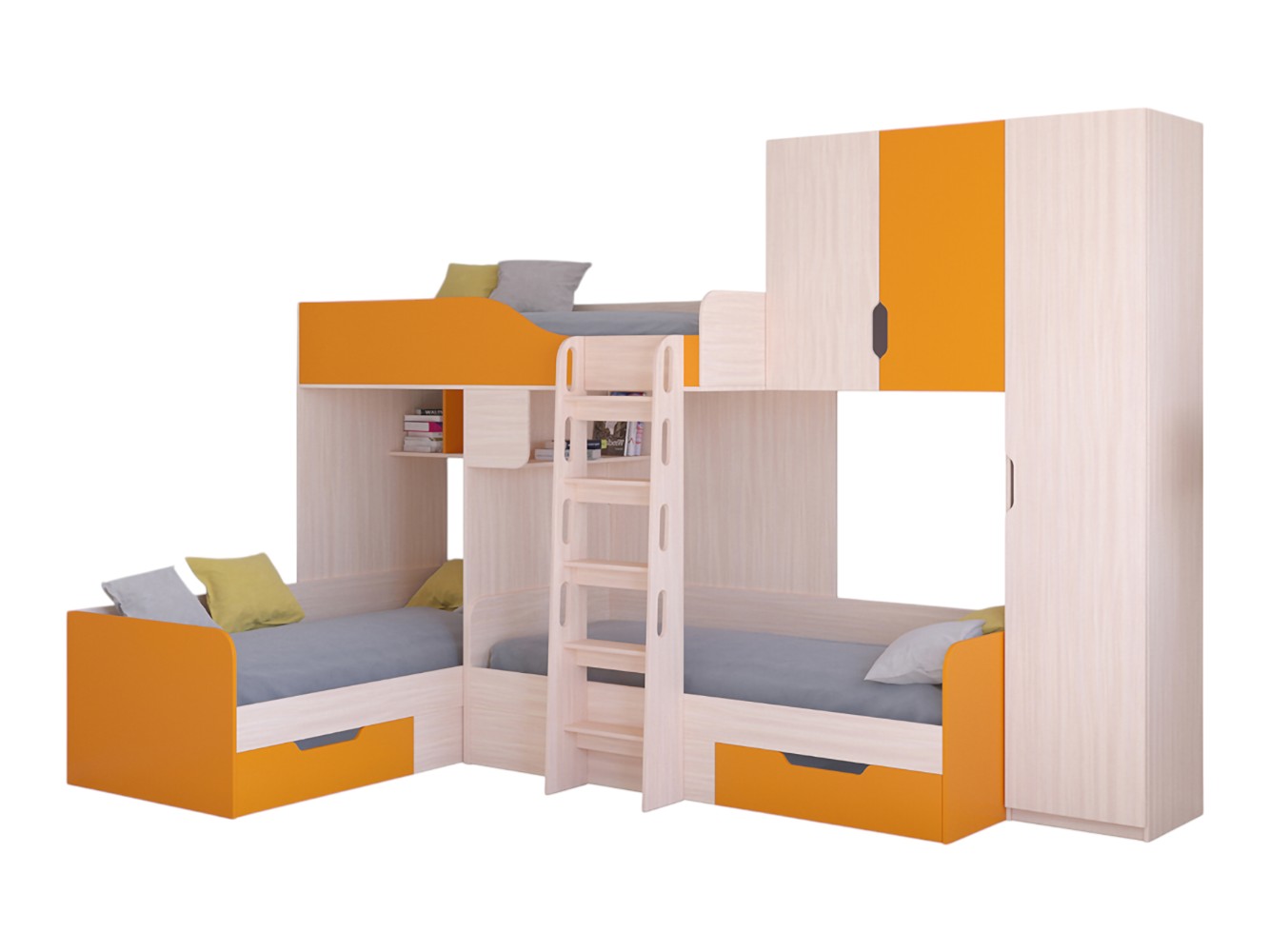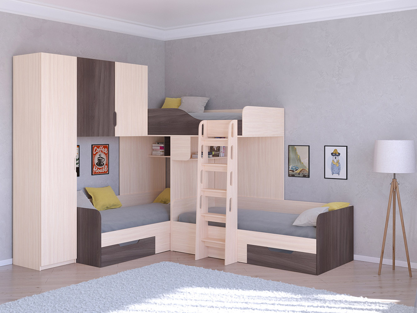 У каждого ребенка будет полноценная зона для сна, а для игрушек и одежды найдется место в ящиках, на полках и в высоком шкафу. Благодаря угловому расположению и дополнительному ярусу кровать экономит площадь, оставляя больше пространства для игр.