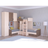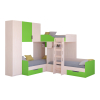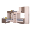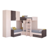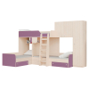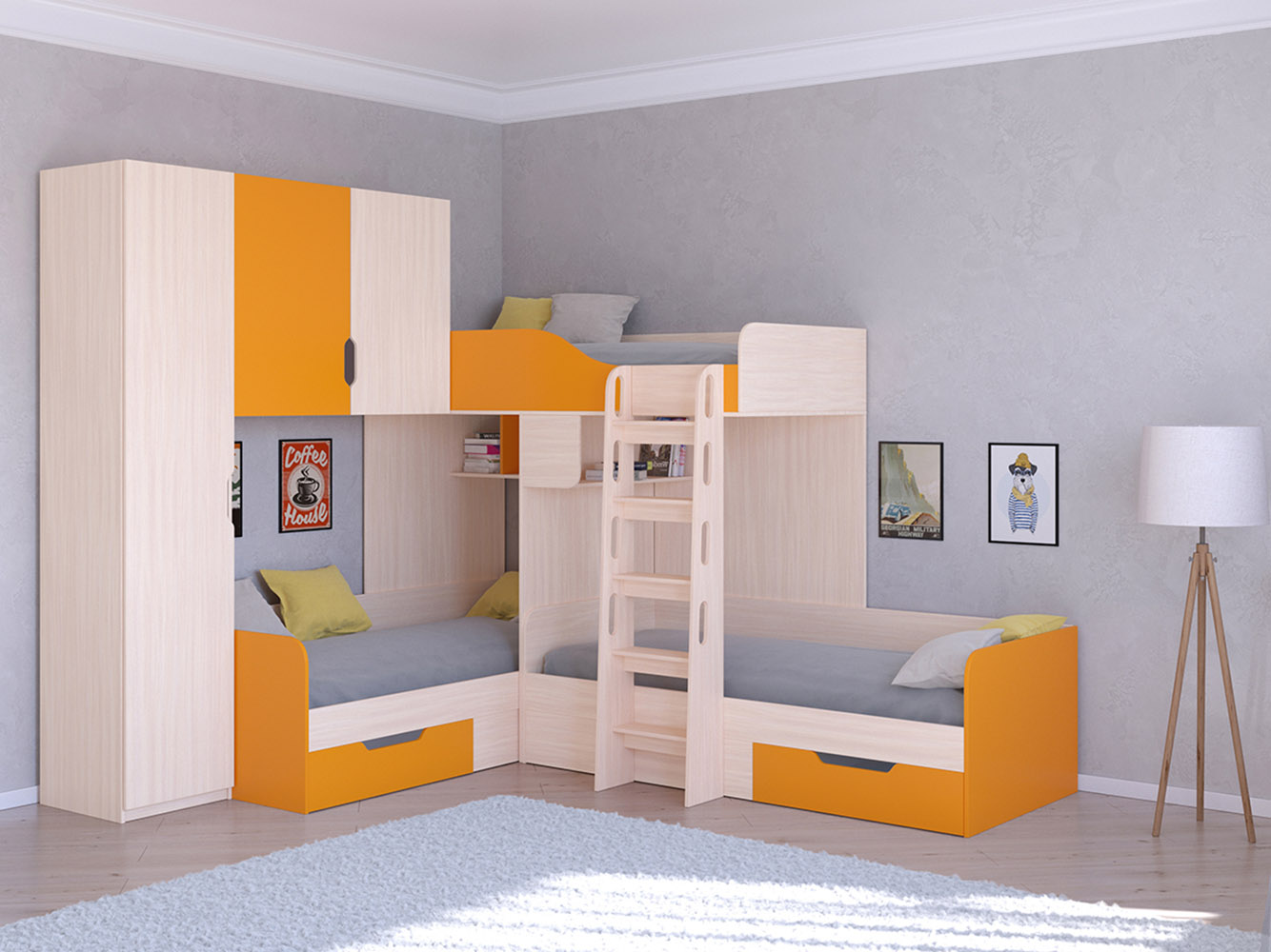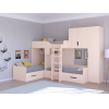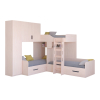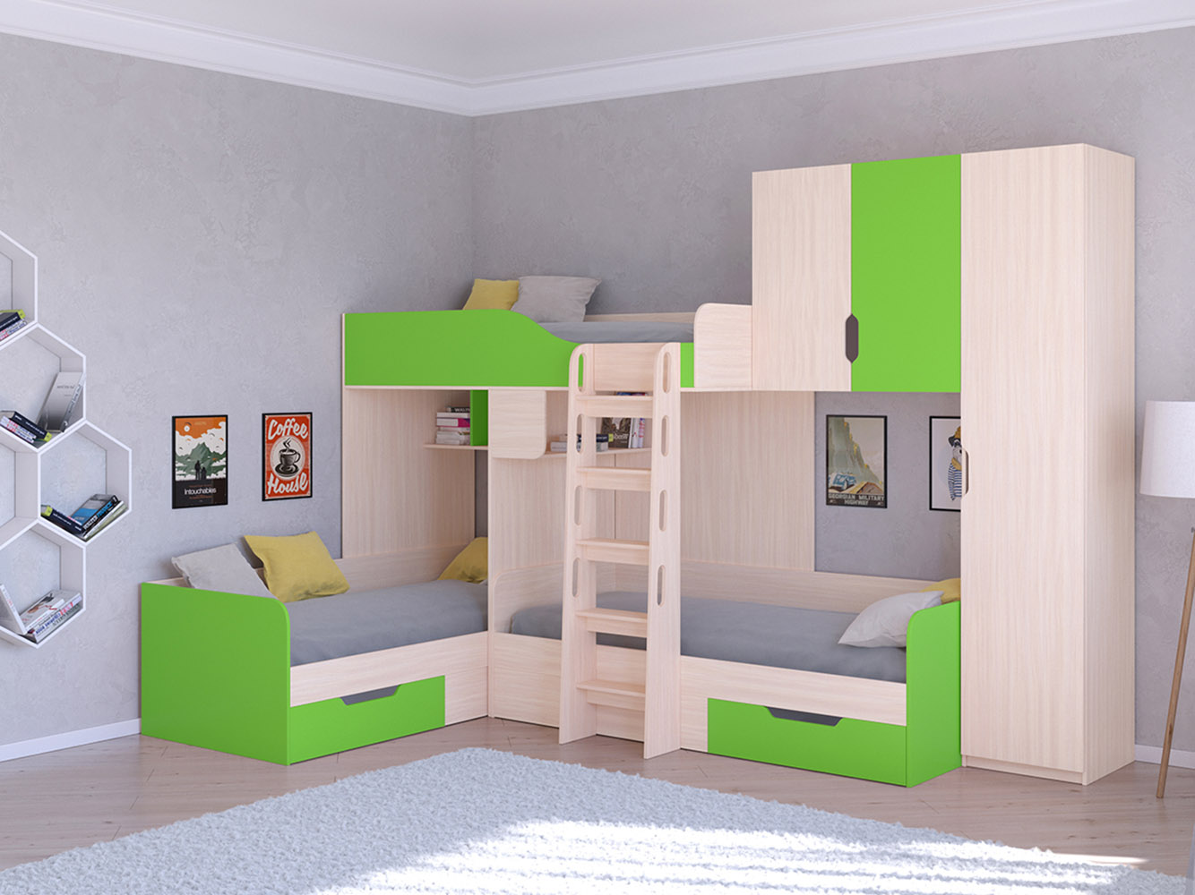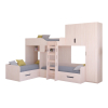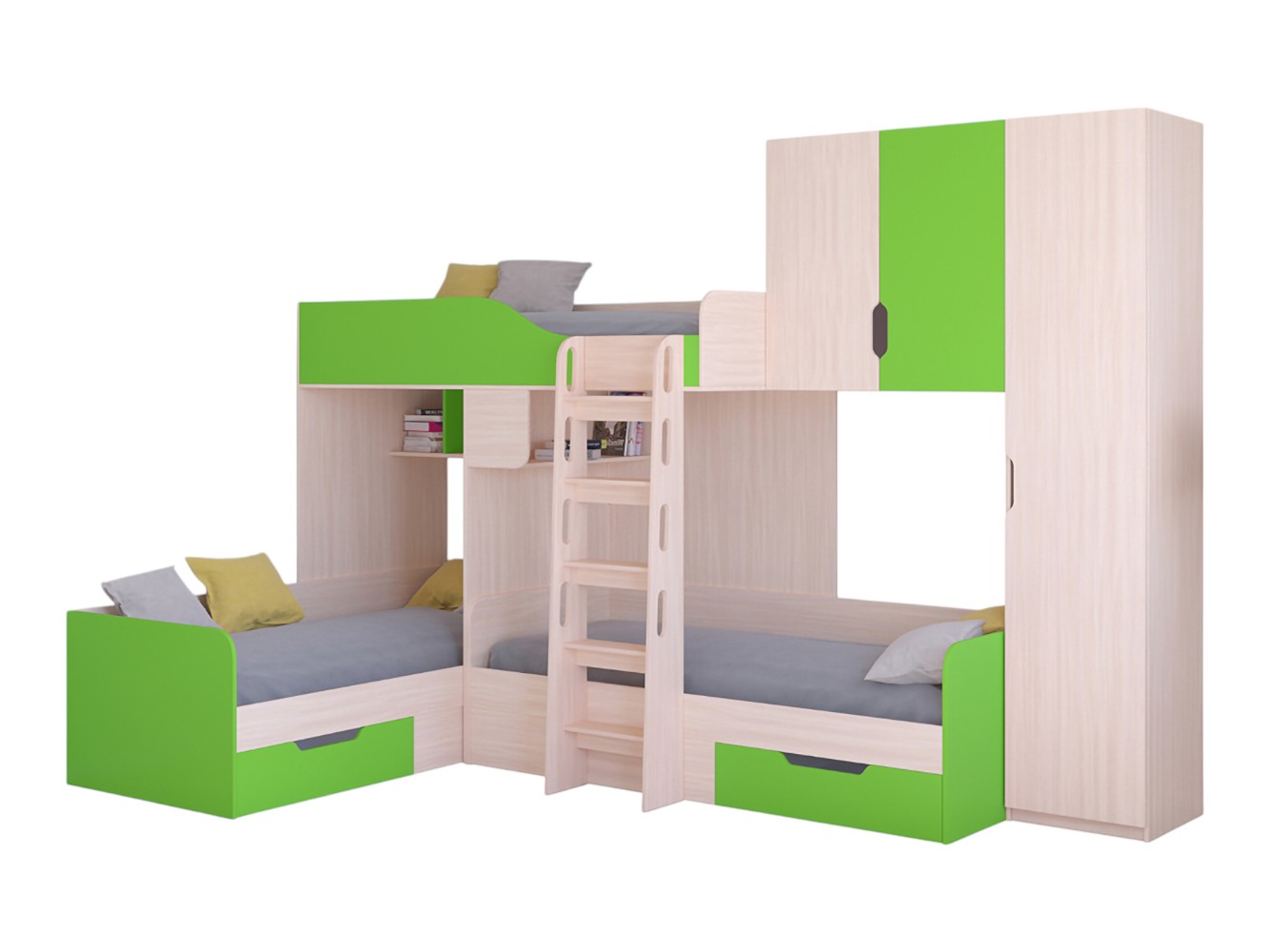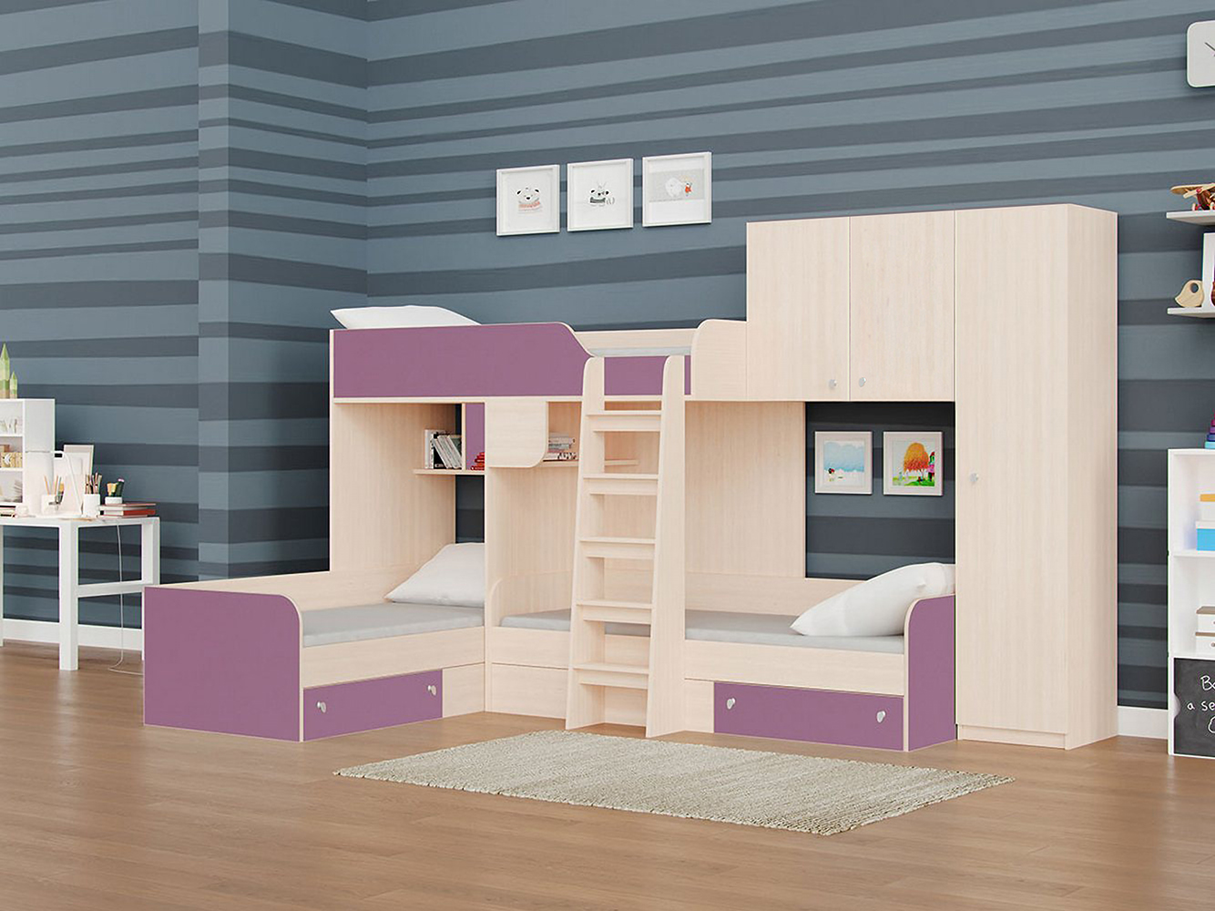 У каждого ребенка будет полноценная зона для сна, а для игрушек и одежды найдется место в ящиках, на полках и в высоком шкафу. Благодаря угловому расположению и дополнительному ярусу кровать экономит площадь, оставляя больше пространства для игр.
