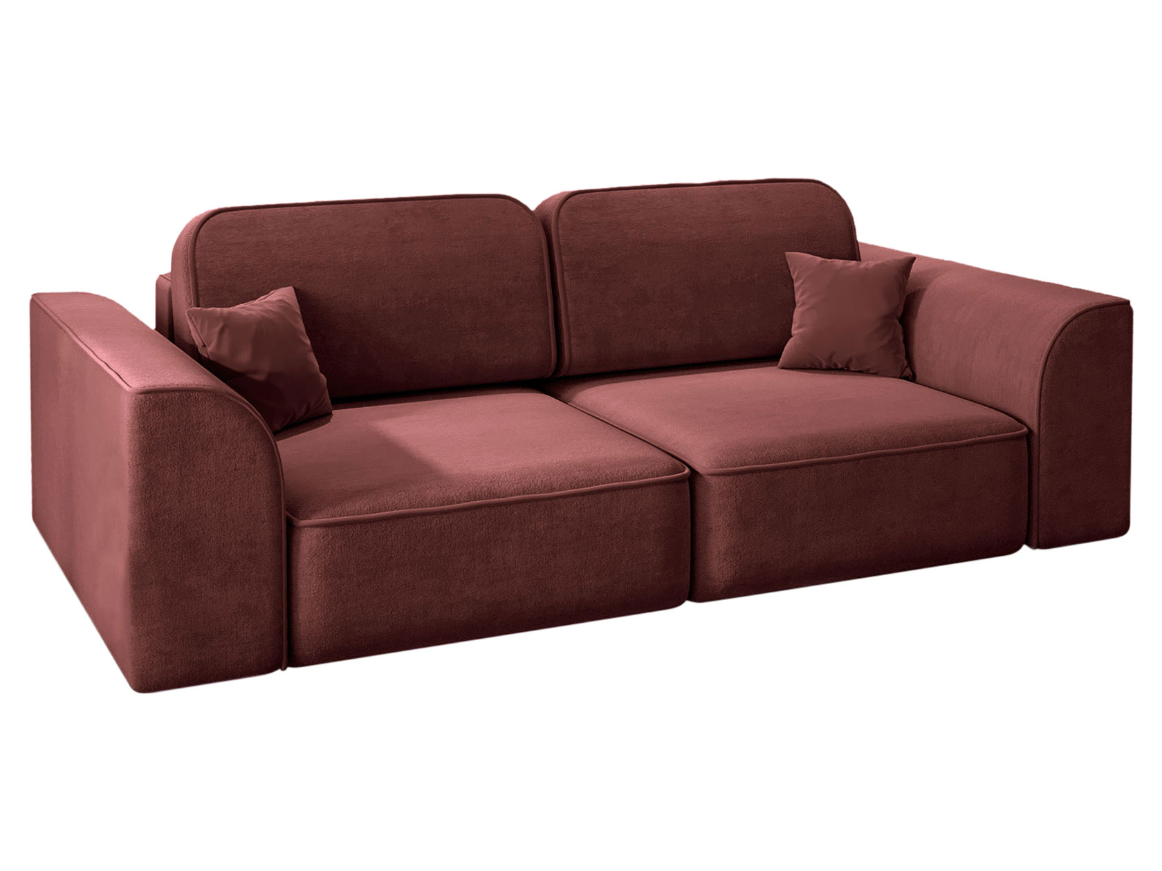Наружные швы на сиденье и боковинах выступают лаконичными акцентами и подчеркивают необычную форму подлокотников. Модель безупречно выглядит со всех сторон, поэтому подходит для зонирования комнаты. Две независимые секции позволяют менять конфигурацию дивана, превращая его в угловую модель, а декоративные подушки — регулировать глубину посадки.