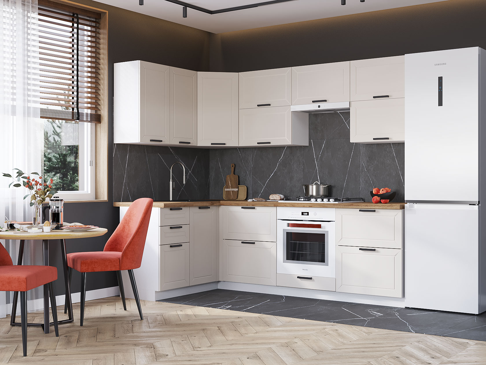 Угловая конструкция поможет разумно использовать площадь. Функциональные элементы с полками и ящиками позволят удобно разместить всю необходимую утварь и посуду. Аккуратные рамочные фасады с матовой поверхностью привлекательно выглядят и не перегружают интерьер.