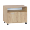 На поверхности можно поставить небольшую оргтехнику, а открытую нишу и зону за распашными дверцами — использовать для хранения папок, важных документов и канцелярии. Мобильную конструкцию на колесиках легко перемещать, оптимизируя рабочее пространство.