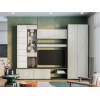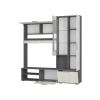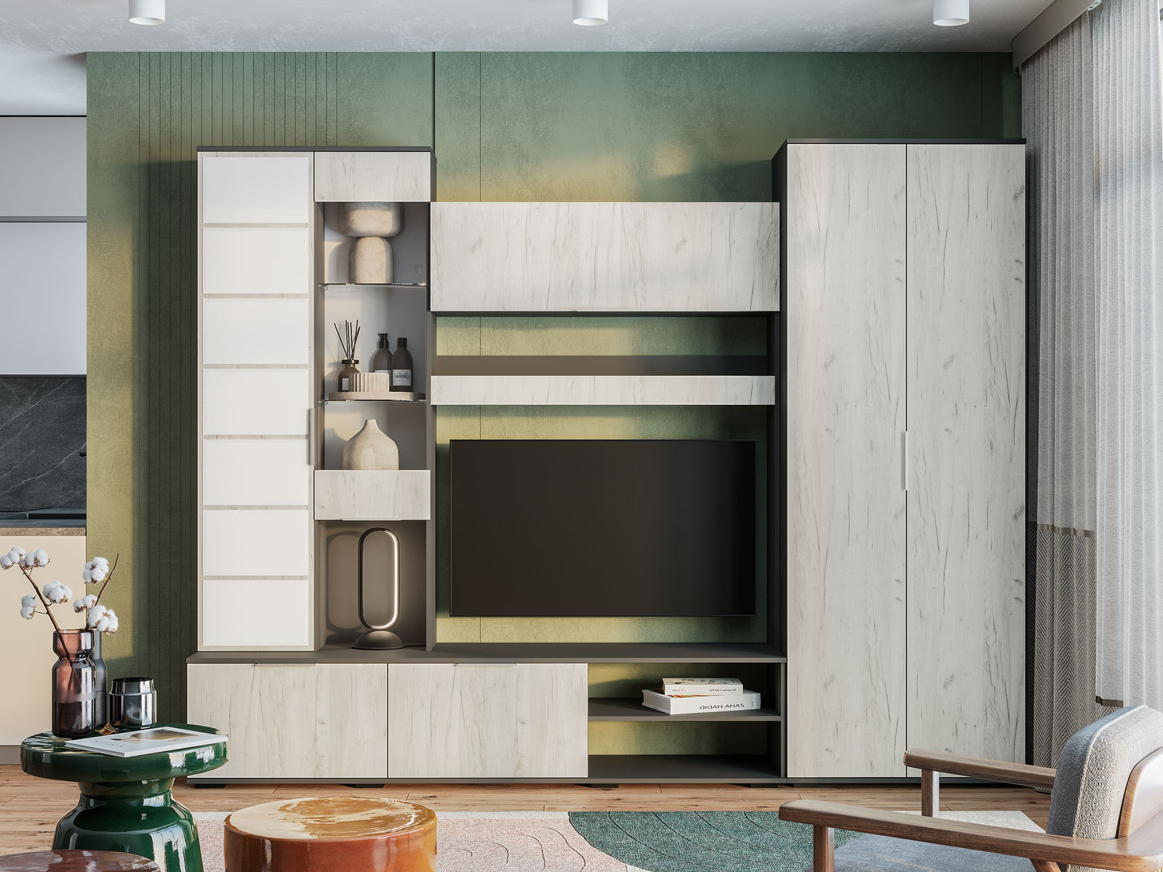 Помимо ниши для ТВ-панели, модель включает удобные шкафы с откидными дверцами, витрину и открытые полки, чтобы распределить книги, декор и различные предметы обихода. Один из фасадов украшен отделкой в виде лакобеля с фацетом, что придает мебели декоративный акцент.