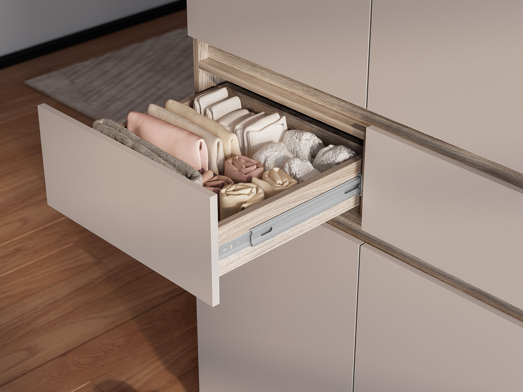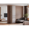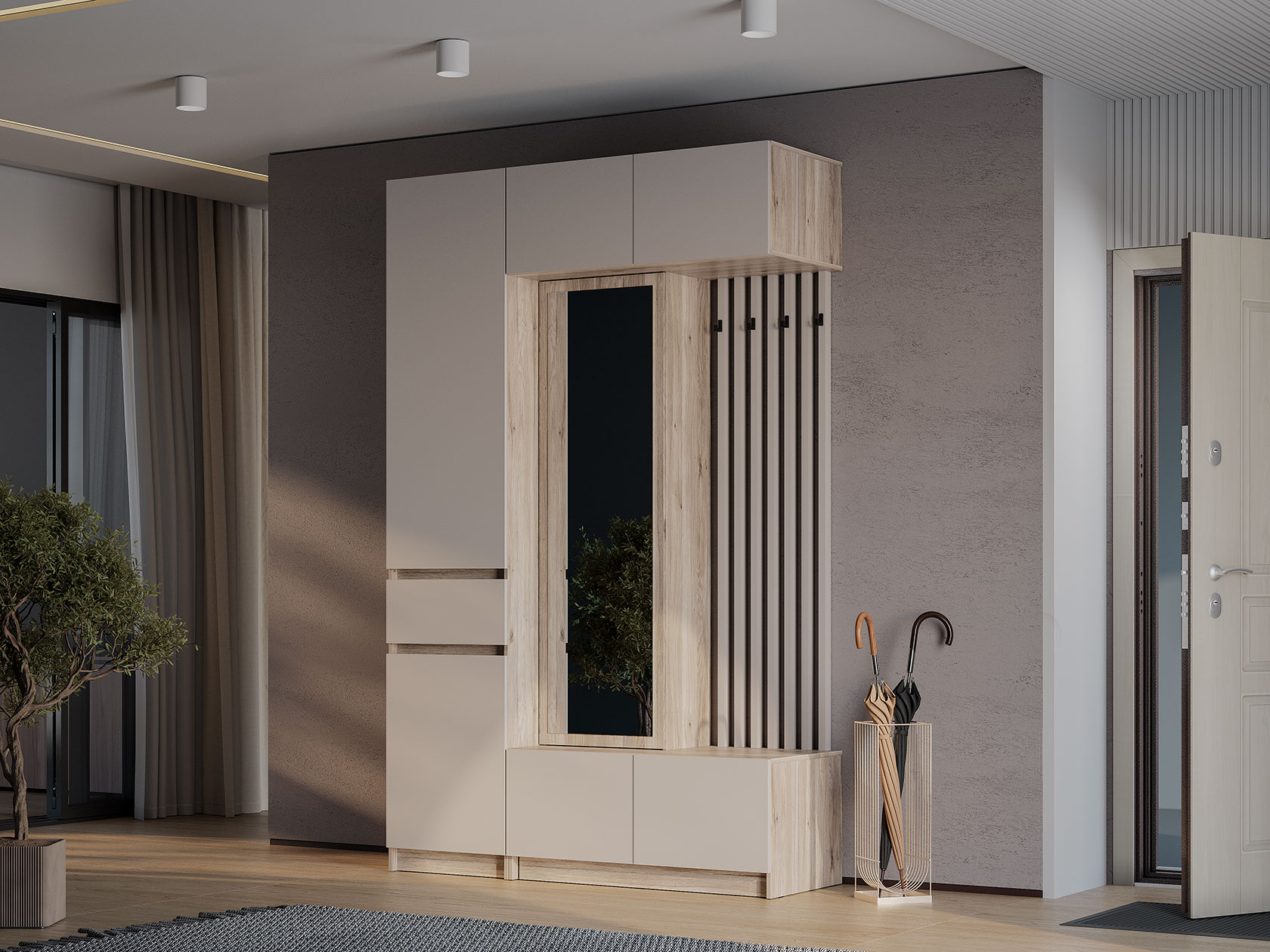 Удобные полки и выдвижной ящик позволяют распределить одежду и аксессуары так, чтобы легко находить нужное даже в спешке. На фасадах нет лицевой фурнитуры, что упрощает уход за покрытием и не перегружает интерьер лишними деталями.
