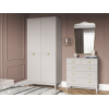 Распашной шкаф обеспечит место для одежды, постельного белья и объемных коробок. Практичный комод позволит аккуратно хранить домашний текстиль и личные вещи. Оригинальные ручки в оттенке золота привлекают внимание к фасадам с фрезеровкой. Высокие опоры облегчают уборку.