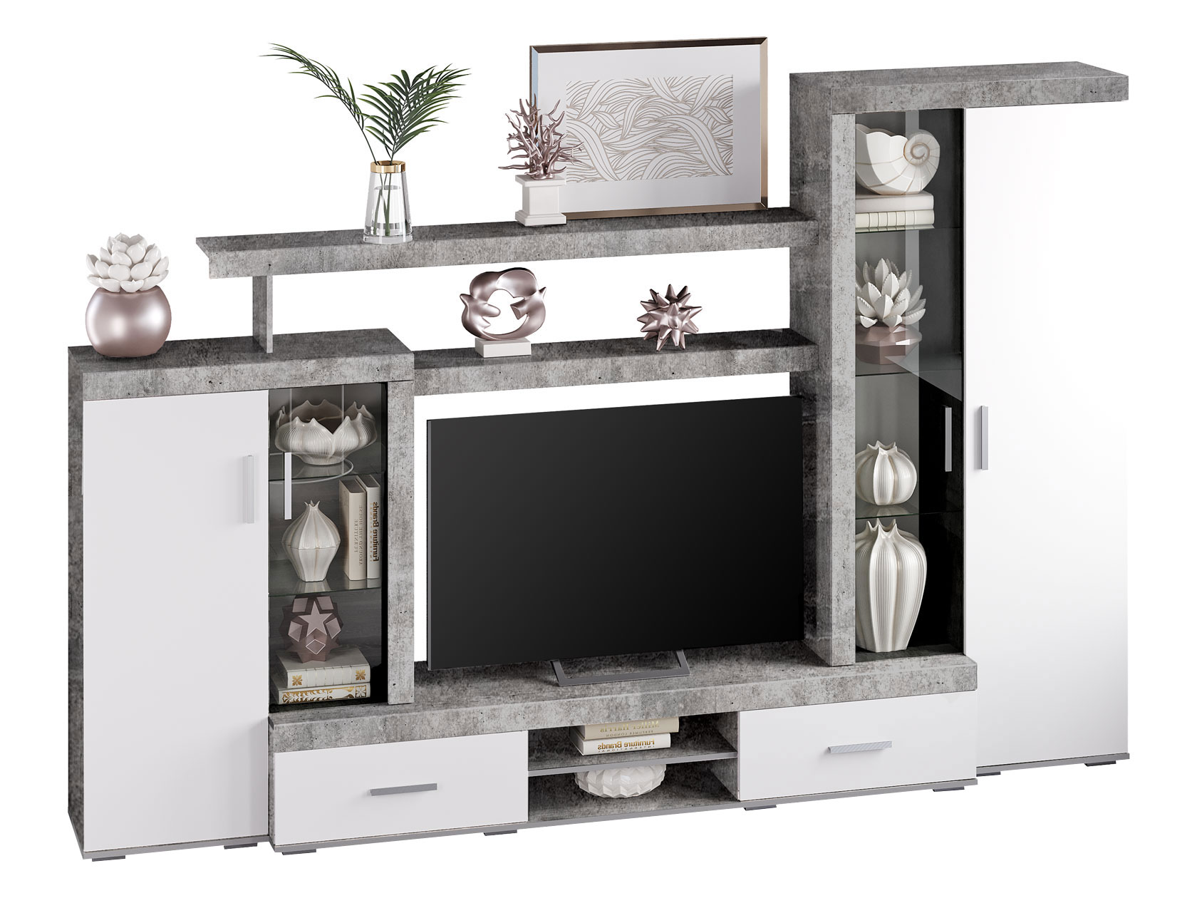 Открытые ниши и стеклянные фасады позволяют украсить интерьер элементами декора. За глухими распашными дверцами и в выдвижных ящиках можно разместить одежду, книги и другие необходимые вещи.