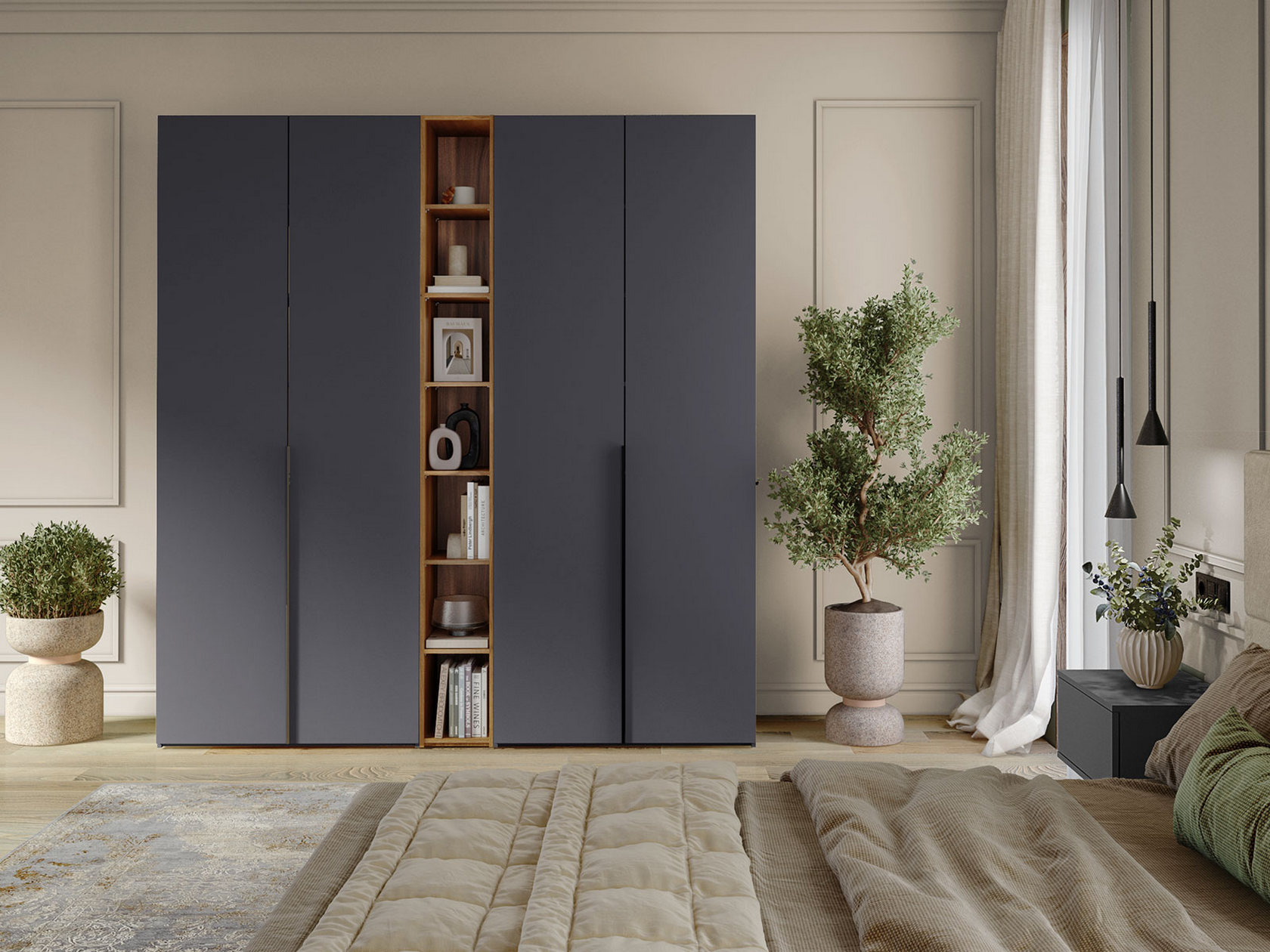 Шкафы позволяют организовать полноценную систему хранения всех предметов гардероба. Центральная часть представлена открытым стеллажом, где можно разместить декоративные элементы, книги или фотографии. Внутри пространство поделено на симметричные секции, каждая из которых предназначена для удобного распределения одежды и аксессуаров. Гладкие матовые фасады с изящными вертикальными ручками привлекательно смотрятся в современном интерьере.