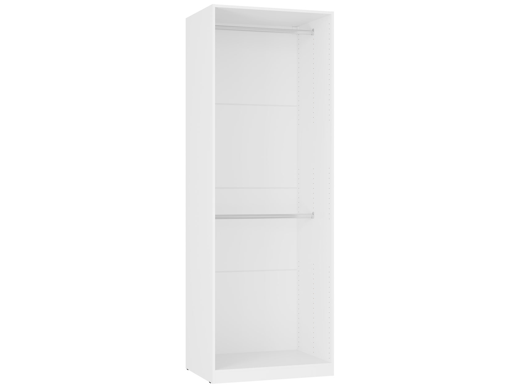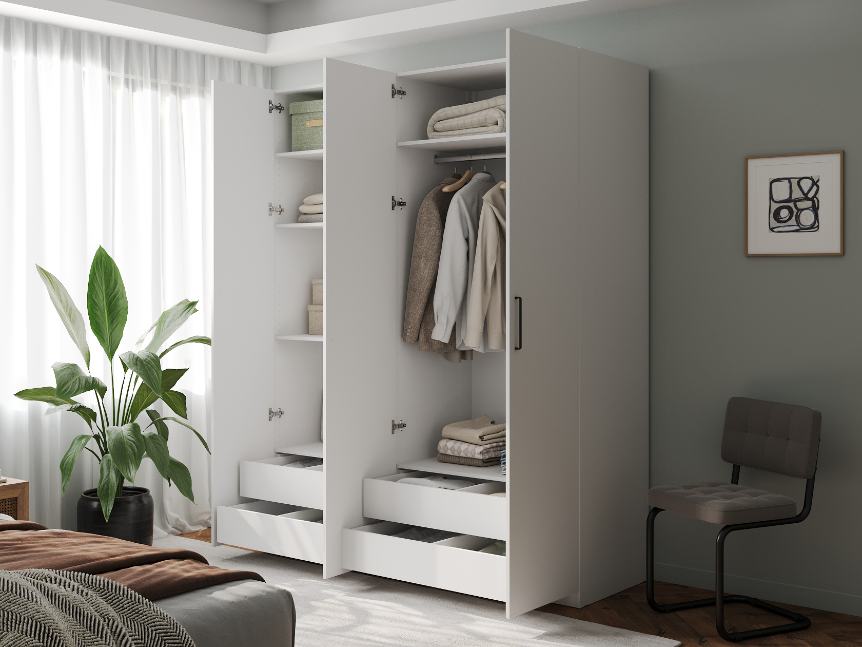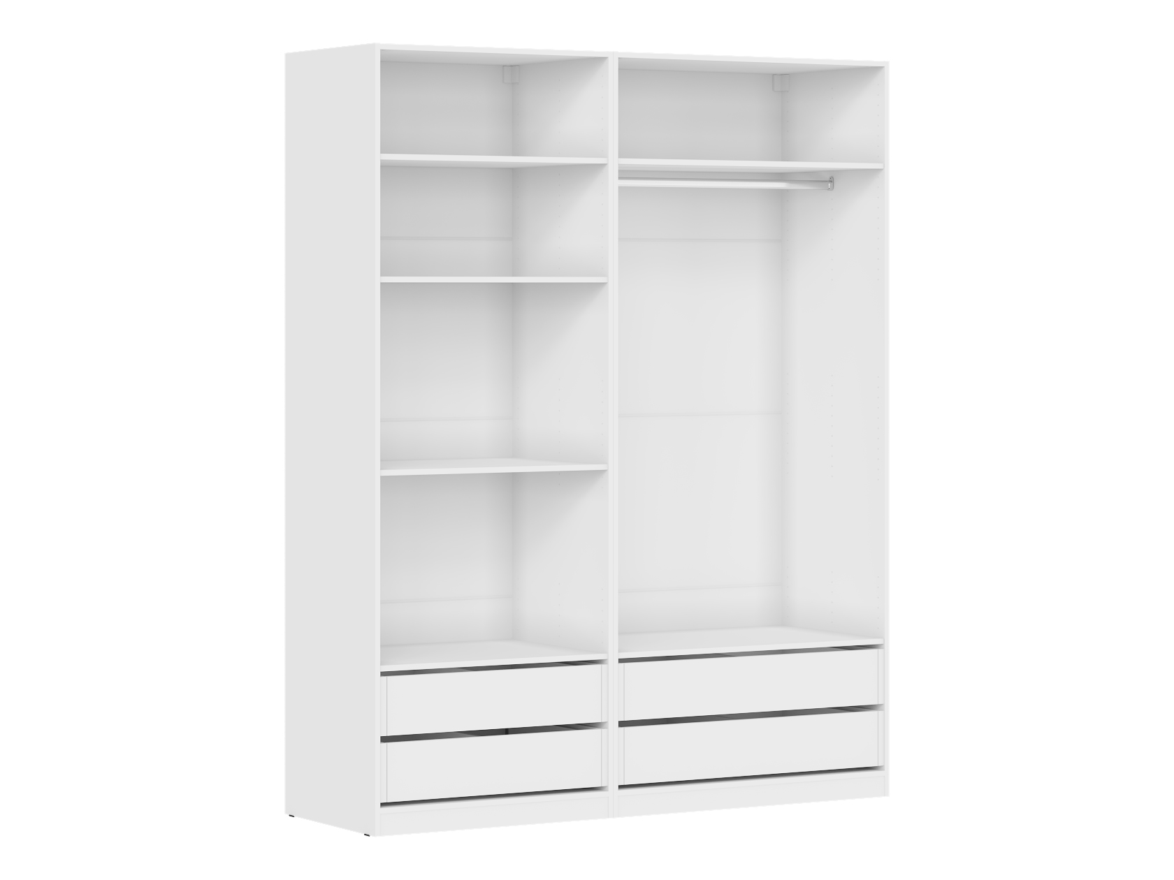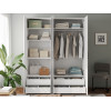 Внутри модель поделена на отдельные секции со штангой для вешалок и полками. В нижней части расположены просторные выдвижные ящики, которые обеспечат место для белья, пледов и другого домашнего текстиля. Дизайн без лишних деталей отлично смотрится в современном интерьере.