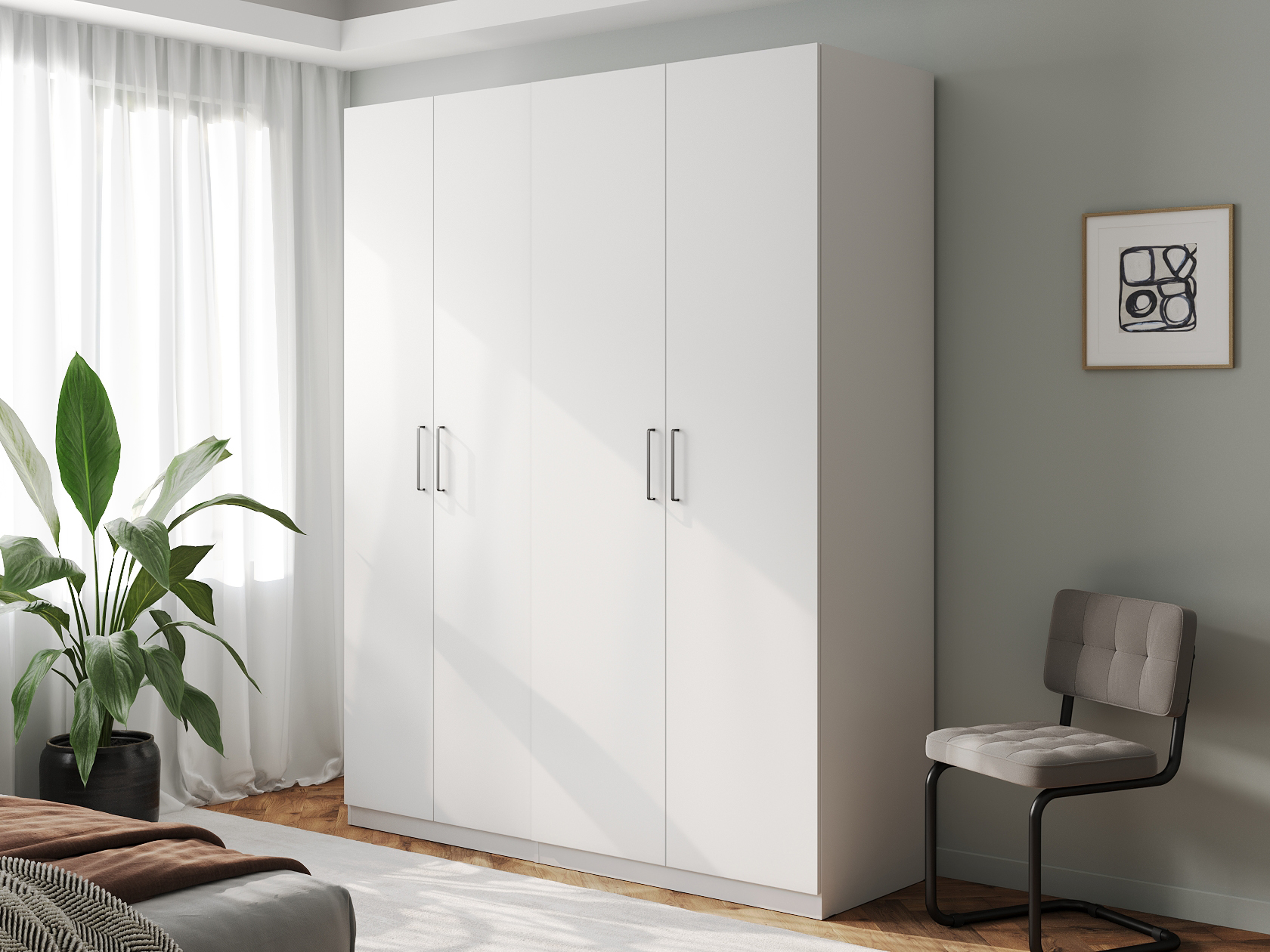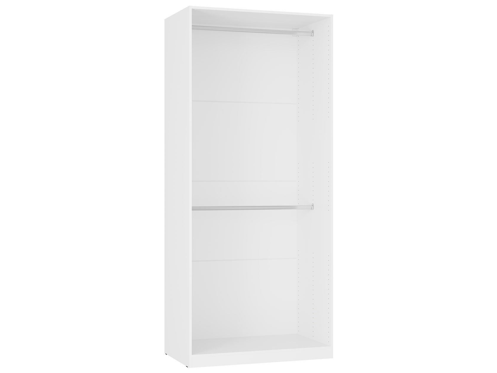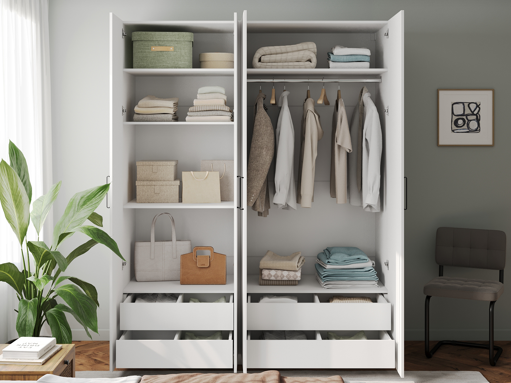 Внутри модель поделена на отдельные секции со штангой для вешалок и полками. В нижней части расположены просторные выдвижные ящики, которые обеспечат место для белья, пледов и другого домашнего текстиля. Дизайн без лишних деталей отлично смотрится в современном интерьере.